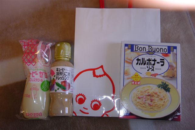 2004年 お土産にキューピーマヨネーズ300g、キューピーテイスティードレッシングイタリアン250ml、キューピーマスタードあらびき100g、アオハタ55ブドウジャム165g